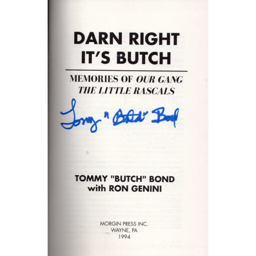 Darn Right It’s Butch is the autobiography of one of the original Our Gang-Little Rascals featuring Spanky, Buckwheat, Alfalfa, and of course Butch. Tommy Butch Bond takes us on a nostalgic trip to Hollywoods Golden Age. Bond played with many luminaries of that time of glitter and imagination including Eddie Cantor, Laural and Hardy, and Herbert Marshall. He takes us behind the scenes and tells us about movie magic with candor and humor that is both fascinating and heartwarming. From his adventures with Our Gang, to his role Jimmy Olsen in the first Superman Serials, and on through his 64 films, Tommys story will entertain and delight you.