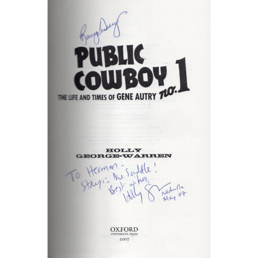 The only performer to earn 5 stars on the Hollywood Walk of Fame–for film, recordings, TV, radio, and live performance–Gene Autry was the singing cowboy king of American entertainment. Now, in Public Cowboy No.1, Holly George-Warren offers the first serious biography of this singular individual, in a fascinating narrative that traces Autry’s climb from small-town farm boy to multimillionaire. Here for the first time Autry the legend becomes a flesh-and-blood man–with all the passions, triumphs, and tragedies of a flawed icon. George-Warren recounts stories never before told, including revelations about Autry’s impoverished boyhood, his adventures as an up-and-coming singer, and the impact his unbelievable success had on his personal life. She describes Autry’s loving but doomed mother, who died on the brink of her son’s success, and his ne’er-do-well father, who married five times and wandered the west. Autry battled his own demons but emerges here in a positive light, an immensely personable man, one of America’s most charitable benefactors, known for his boundless generosity, and a patriot who enlisted during World War II. The book provides equally colorful details of Autry’s lengthy radio and recording career, which included such classics as “Back in the Saddle Again” and “Rudolph the Red-Nosed Reindeer”; his movie career, where he breathed new life into the Western genre; and his role in early television, being the first movie star to develop his own TV shows. And along the way, we see how he invested shrewdly in radio, real-estate, and television, becoming the owner of the California Angels and the only entertainer listed among 1990’s Fortune 400. Based on exclusive access to Gene Autry’s personal papers, as well as interviews with more than 100 relatives, employees, colleagues, and friends, this engaging biography brings to life a major Hollywood star–a man who, more than anyone else, put Western music and style on the American cultural map.