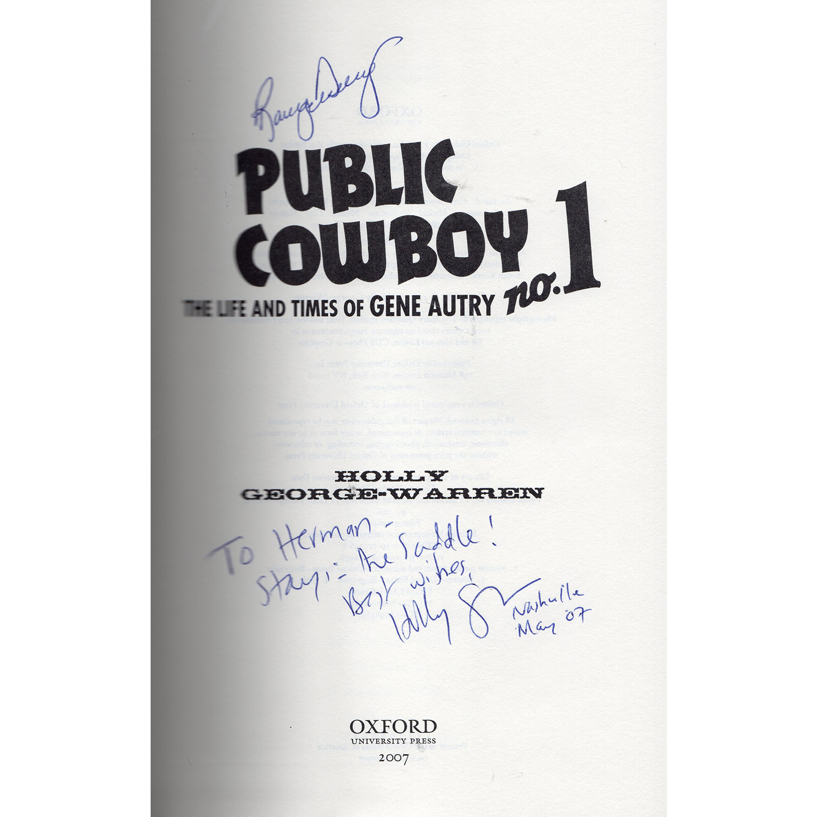 Condition:  This hardcover book and dust cover are in very good condition.  The inside page is signed by Holly George-Warren (to Herman)!