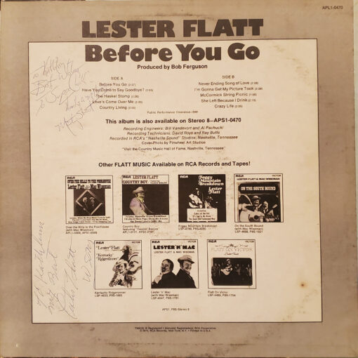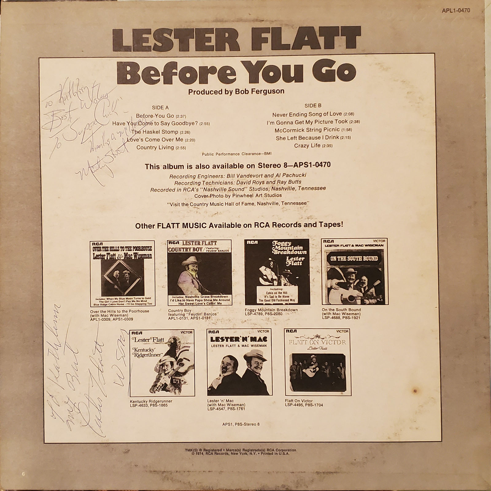 Condition: The LP is in good condition. The cover is in good condition with some wear around the edges. The back of the cover is signed by Lester Flatt & Marty Stuart (to Kathleen)!