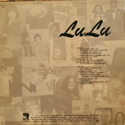 Condition: The LP is in good condition with some wear (no inner sleeve). The cover is in fair condition with wear around the edges and a tear on the bottom edge. There is also some minor creases. The back of the cover is signed by Lulu! (See picture – it is signed in ink and is harder to see).