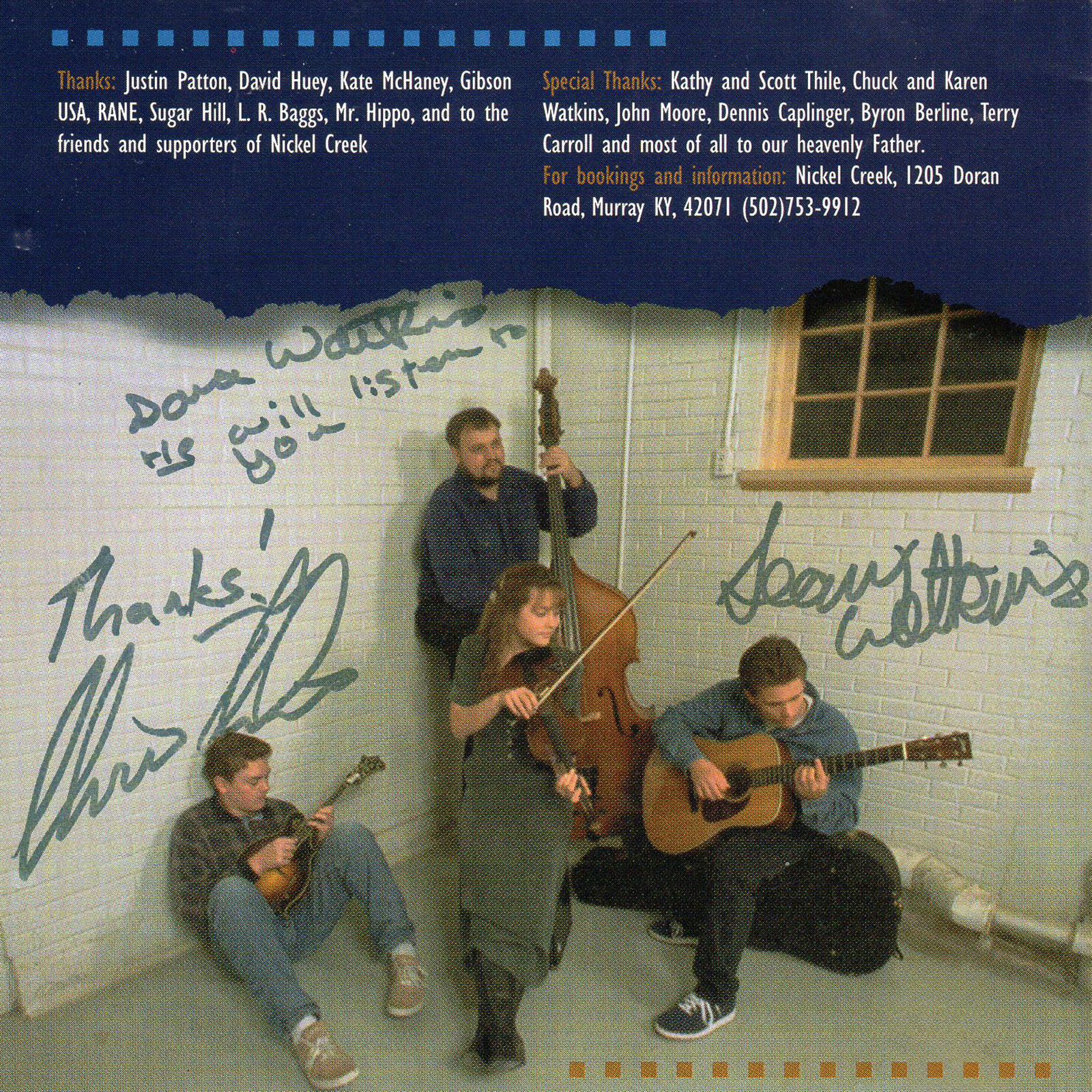 Condition: Both front and back inserts are in great condition..cd has a few minor surface marks, however it plays perfectly on my cd player….backside of the front insert has been signed by Sara, Chris and Sean with a silver sharpie…This is a super rare and hard to find cd by Nickel Creek that was released in 1997 prior to their major label days…..and is even harder to find autographed