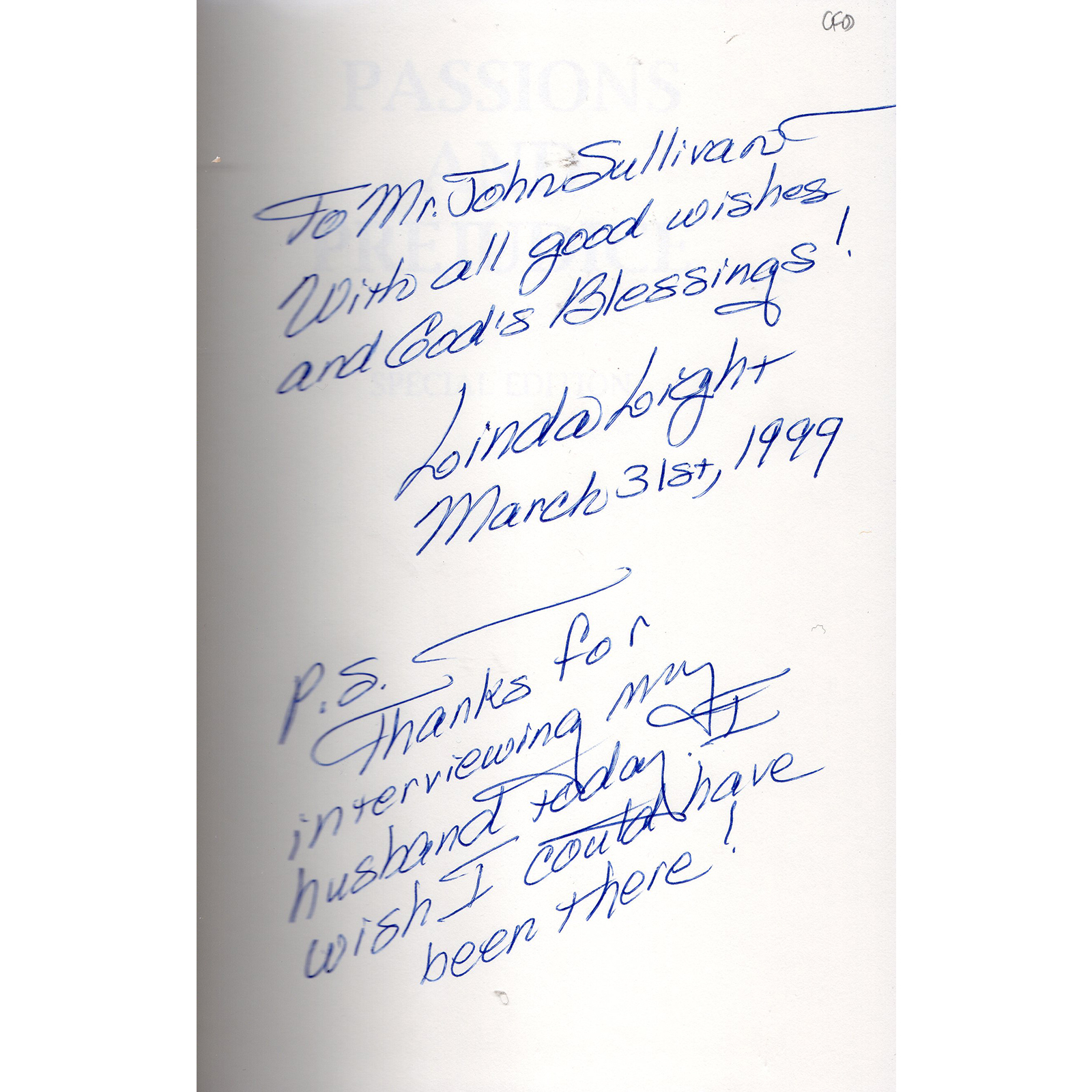 Condition: This hardcover book, pages, binding and dust jacket are all in great condition. Front page has been signed by Linda with a blue pen as follows: To Mr John Sullivans with all good wishes and God’s blessings! Linda Light March 31st, 1999. P.S. Thanks for interviewing my husband today. I wish I could have been there!
