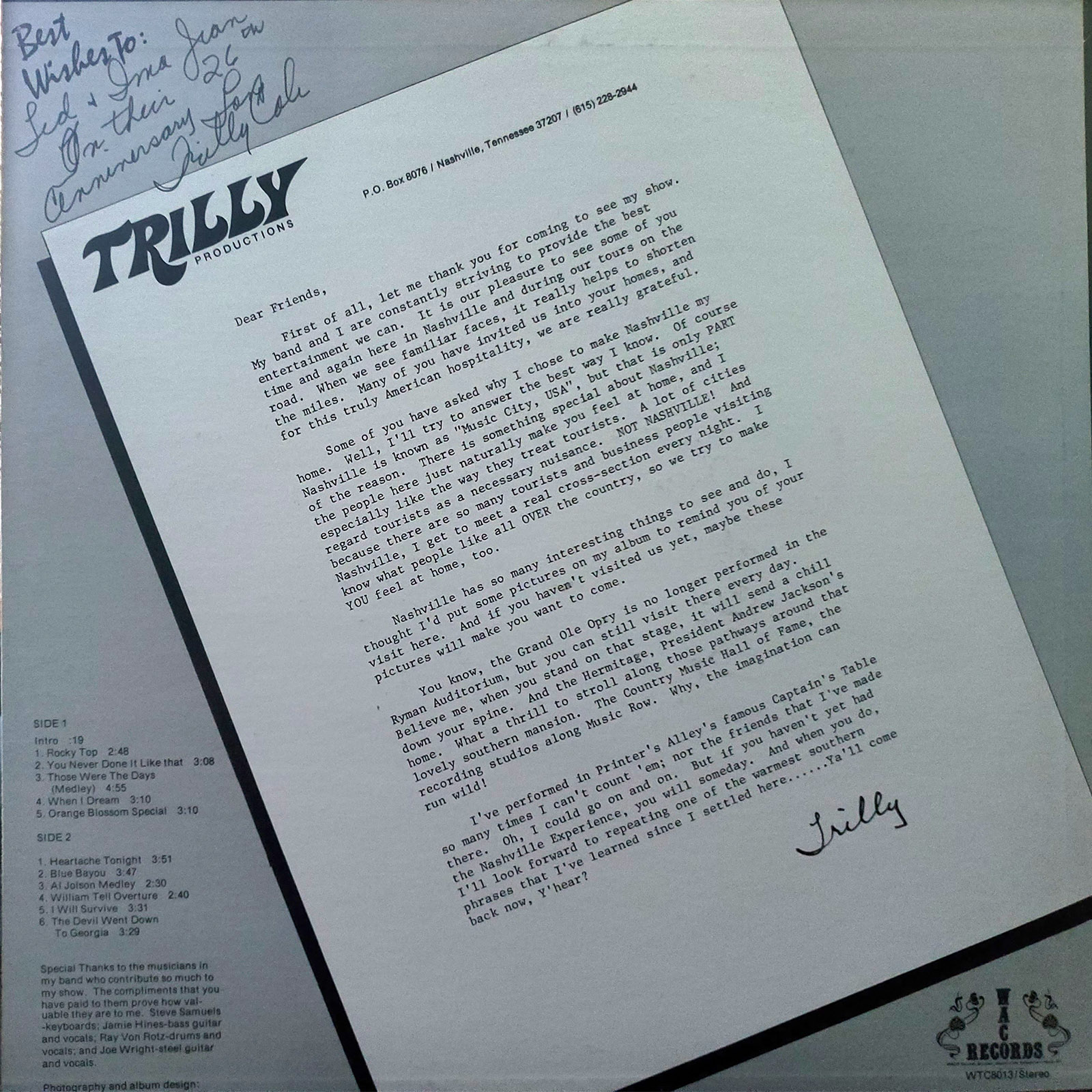 Condition: The LP and cover are in very good condition except for minor wear on the edges of the cover. The back cover is signed by Trilly Cole (to Ted & Ima Jean)!